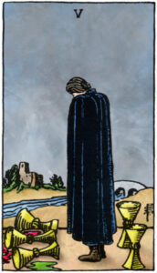 In de tarot staat de kleur zwart ook voor afsluiten. Vasthouden en alleen dragen. Kijk maar naar de 5 van bekers, de persoon die alleen staat, omhuld in een lang zwart kleed, die zich sterk houdt, recht houdt en zijn verdriet alleen wil of lijkt te dragen. Een persoon die alleen het verdriet, de pijn, het schuldgevoel of wat verloren is aankijkt, durft te voelen, wanneer niemand het ziet. En tegen de buitenwereld zegt: ‘Ja hoor, alles gaat goed!’